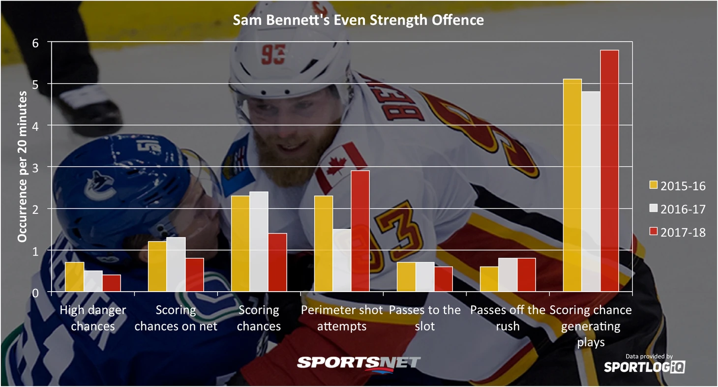 Прогрессом можно выделить то, что Беннетт, находясь с партнерами в равных составах, лучше контролирует шайбу: в сезоне 2015/16 они создавали 4,6 опасных момента за 20 минут в среднем, в сезоне 2016/17 эта цифра выросла до 5,1. В текущем сезоне она составляет 6,4.