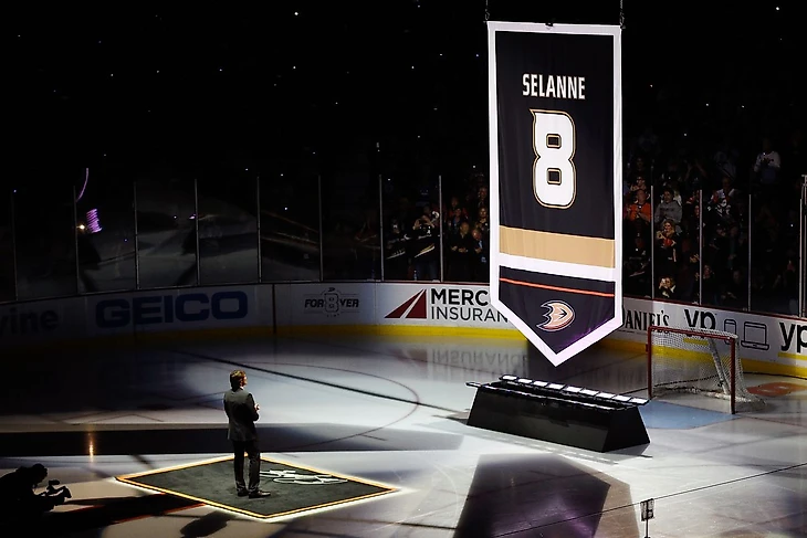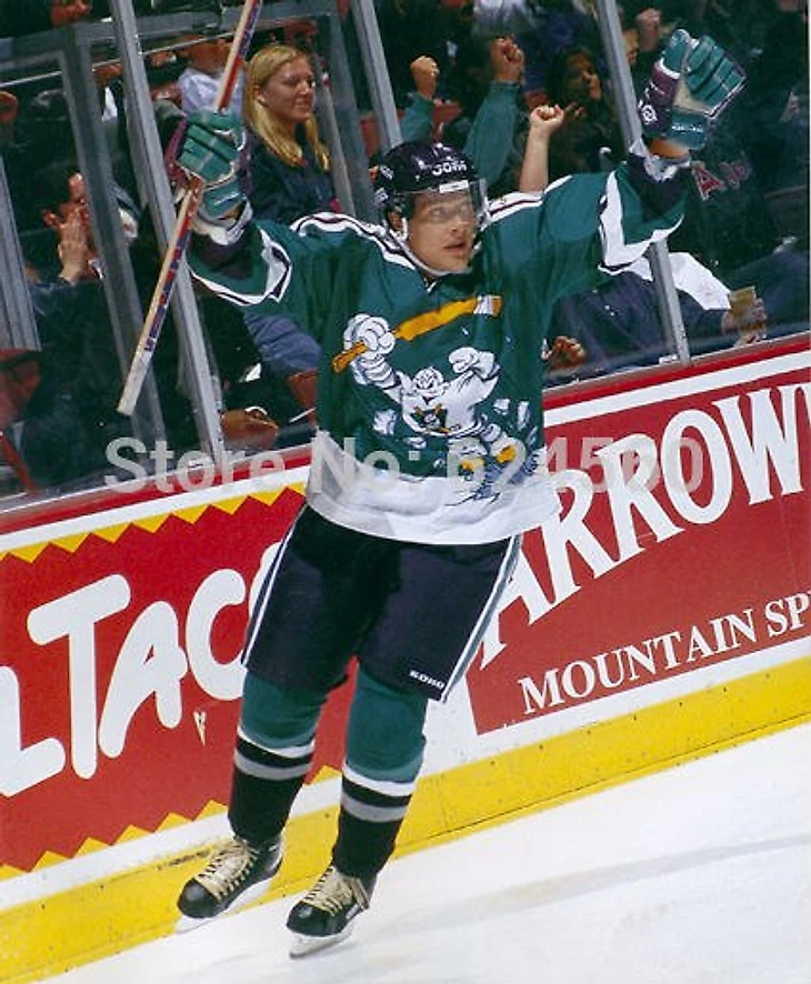 Великолепный Теему Селянне. Был обменян из Виннипега в Анахайм в 1996 году. Играл за Дакс с 1996 по 2001, потом некоторое время выступал за Сан-Хосе и Колорадо, но в 2005 году вернулся в Анахайм, где в конце концов и закончил свою карьеру в 2014. Кстати, на этом фото Селянне в одной из самых оригинальных джерси в истории хоккея.