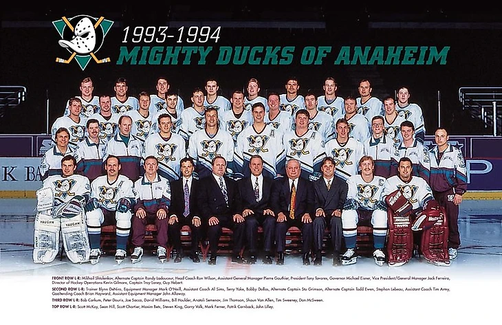 Самый первый состав команды, сезона 1993/94. Майкл Эйснер, глава «Диснея» не долго думал, как назвать команду. В 1992 году на экраны мировых кинотеатров вышел фильм «Могучие утята», повествующий о детской команде из Миннесоты. Этот фильм сразу стал популярен, и именно на этой популярности у Эйснера зародилась идея создания команды с таким же названием и лого как у ребят из фильма.  Но вернемся к «настоящим» Уткам. Первым капитаном команды из Анахайма стал Трой Лоуни, правда, всего на один сезон. Потом его место на долгие годы занял Пол Кария.