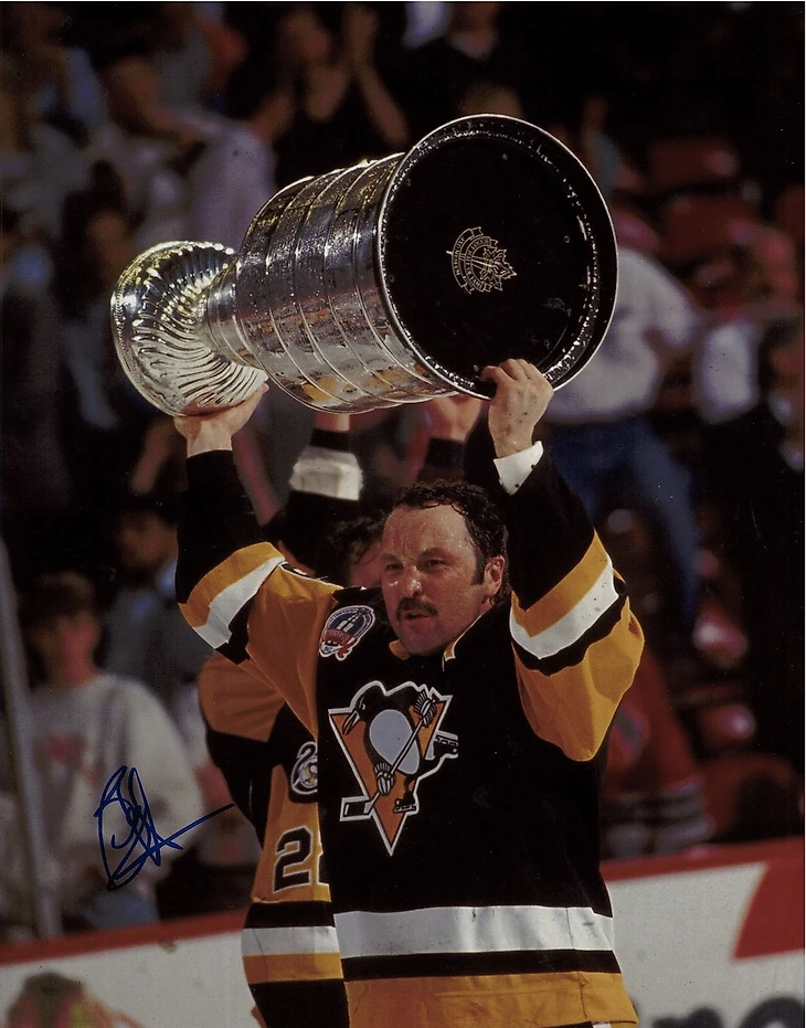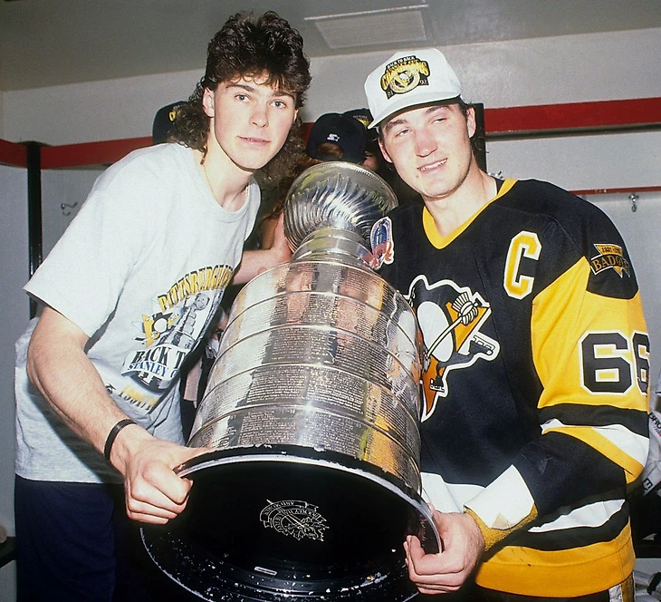 Легенда Пингвинз всех времен и народов, «Супер» Марио Лемье с Кубком Стэнли-92. В том финале, команде из Питтсбурга противостояли Чикаго Блэкхоукс. В итоге, Блэкхоукс в том финале не одержала ни одной победы. Лемье стал MVP. На фото, рядом с Марио, с ассистентской нашивкой, запечатлен Боб Эрри, отдавший Пингвинз 10 лет своей карьеры, двукратный обладатель КС в составе «Пингвинов». Сейчас трудится аналитиком на хоккейных ТВ-каналах США.