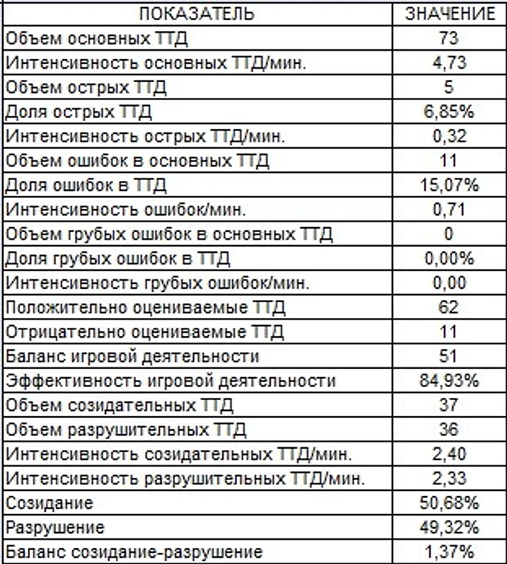 73 тактико-технических действия за одну игру это довольно много. При этом, баланс созидания-разушения напоминает Инь и Янь, никакого перекоса, идеальное сочетание для нападающего оборонительного плана: