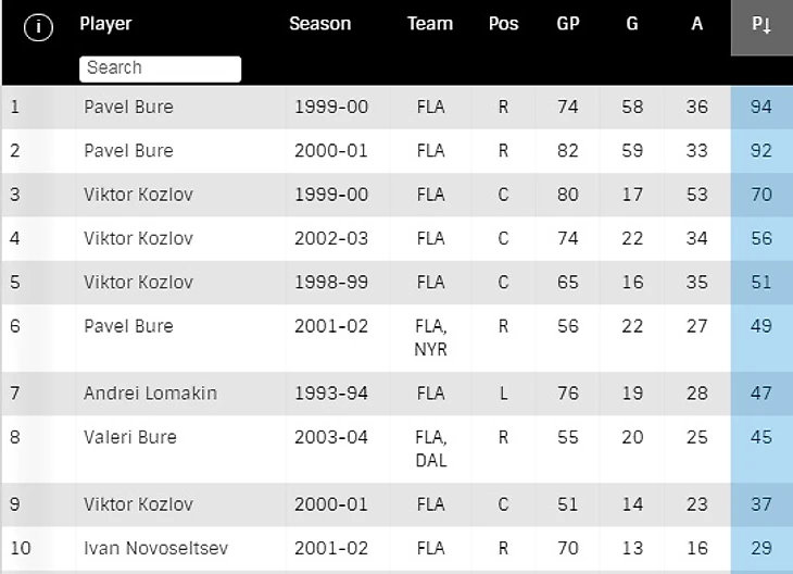 В начале 2000-х «Флорида» была русской командой. Главной звездой был Павел Буре, а в его окружение входили брат Валерий, Виктор Козлов, Олег Кваша, Иван Новосельцев, какое-то время даже Игорь Ларионов. Именно к тому времени и относятся почти все лучшие русские сезоны в истории «Флориды».