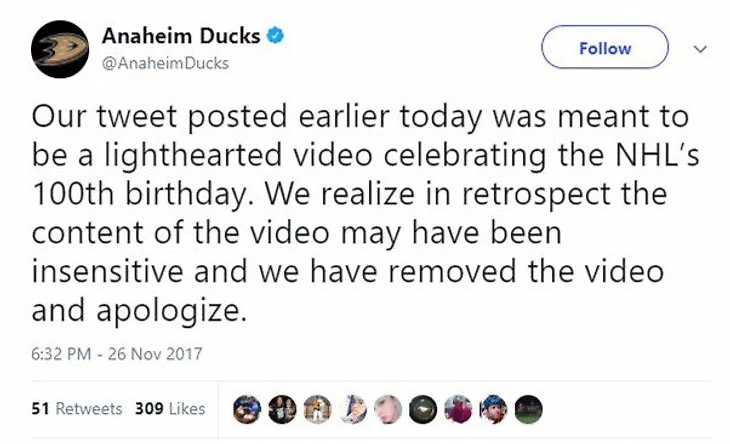 «Анахайм» удалил видео и извинился: «Твит, который мы опубликовали раньше, должен был стать беззаботным поздравлением со 100-летием НХЛ. Теперь мы понимаем, что видео неуместно. Мы удалили ролик и просим прощения».