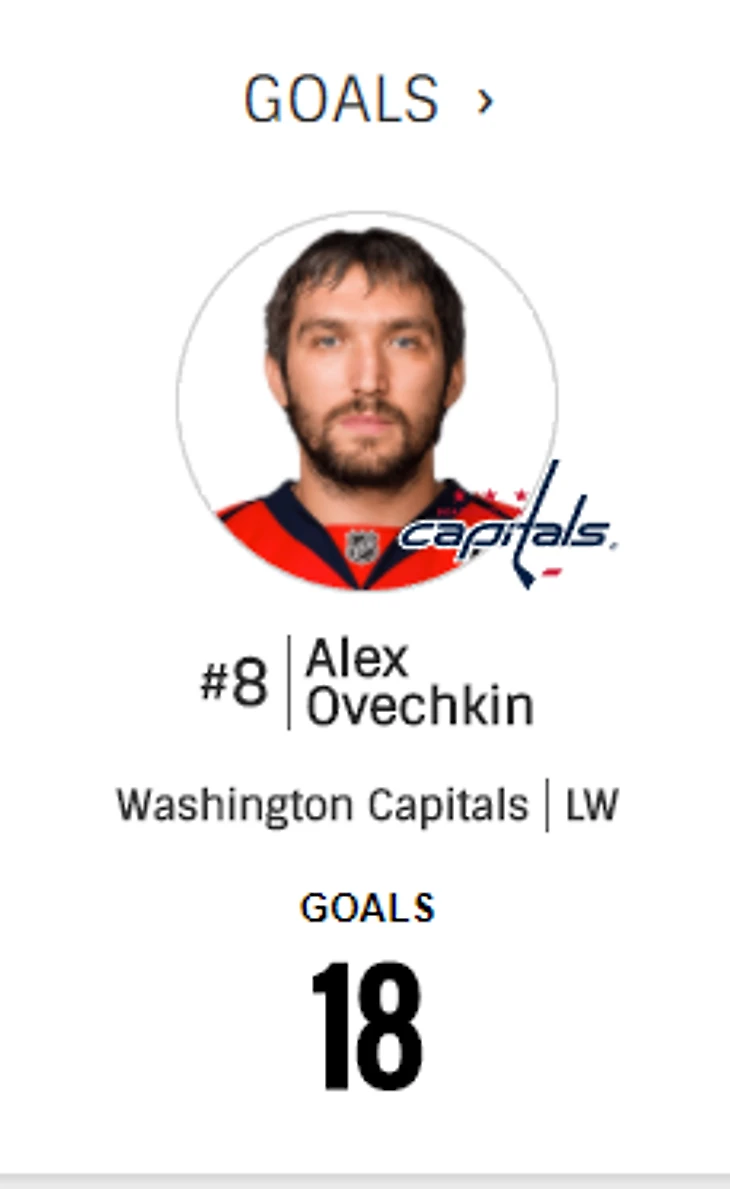 На данный момент российский форвард лидирует в лиге по голам. После хет-трика в ворота «Торонто» их у него стало 18, в то время как его соотечественник Никита Кучеров отстает от Овечкина на 1 шайбу.