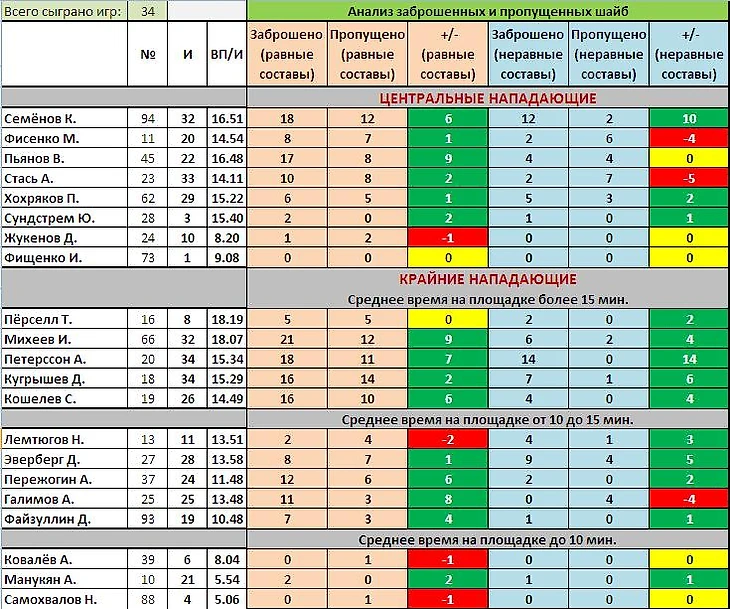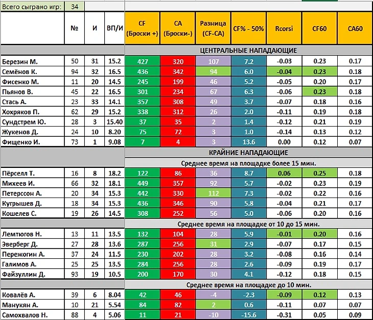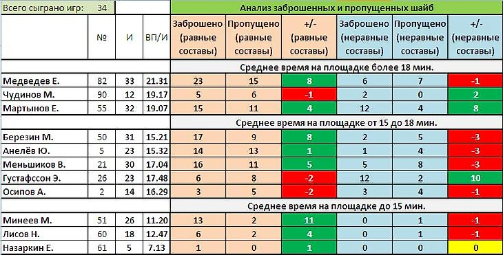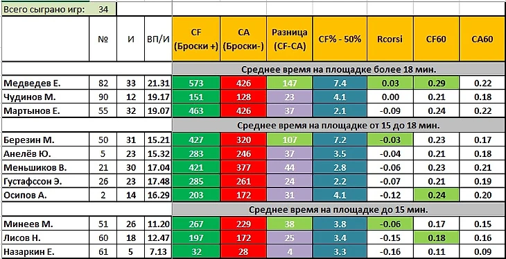 Отмечаем лидеров в своих группах по разнице бросков: Евгений Медведев (+147), Максим Березин (+107), Максим Минеев разница (+38). Бросается в глаза находящиеся на 4 и 5 местах в своей группе Густафссон и Осипов. Нахождение того или иного игрока в своей группе выстроено по рейтингу Rcorsi, наилучшие показатели вверху и по убыванию.