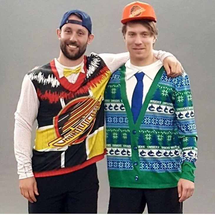 Сэм Ганье и Маркус Гранлунд из Ванкувера позируют, в так называемых, ugly sweaters, или если по-нашему, уродливых свитерах. Ребята, конечно не эталоны моды, но для рождества в Ванкувере сойдет! Наряды то веселые!