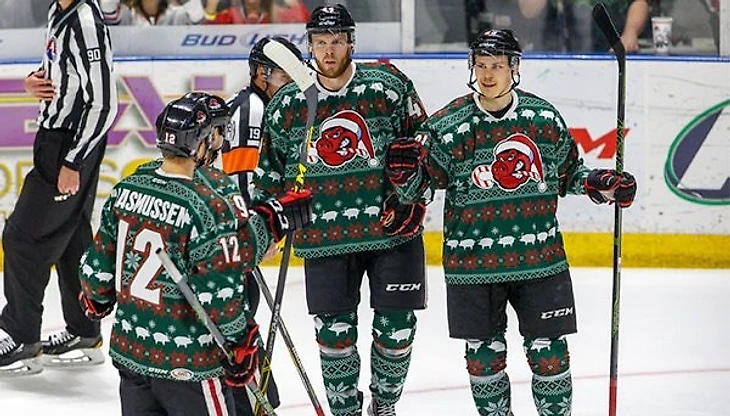 В АХЛ к Рождеству команды наряжаются соответствующе духу праздника. Вот в таких свитерах играют Рокфорд АйсХогс, фарм Блэкхоукс.