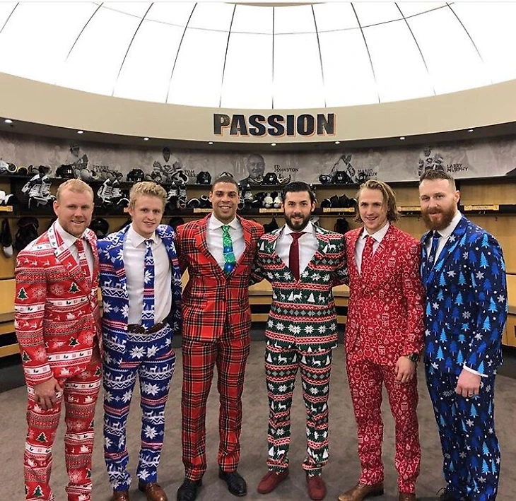 Вот так хоккеисты Питтсбурга нарядились перед матчем с Анахаймом. У ребят однозначно в головах уже во всю было празднование этого святого праздника, ведь они в итоге проиграли хоккеистам Дакс.