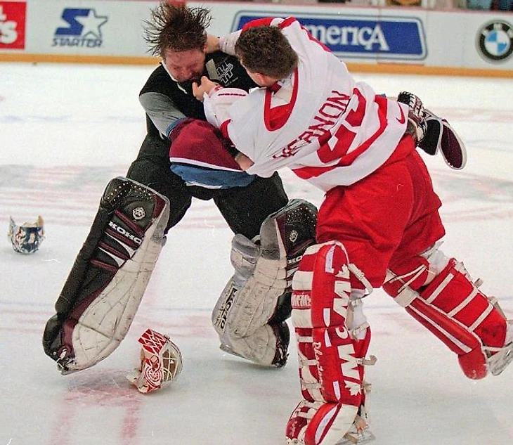 В этом искрометном дерби выясняли отношения и вратари. Вот фото драки легендарных Патрика Руа и Майка Вернона.