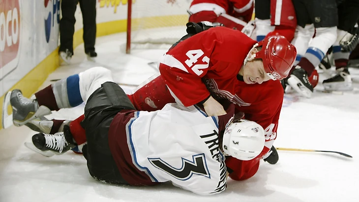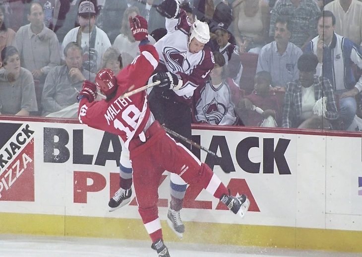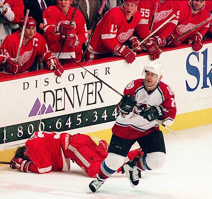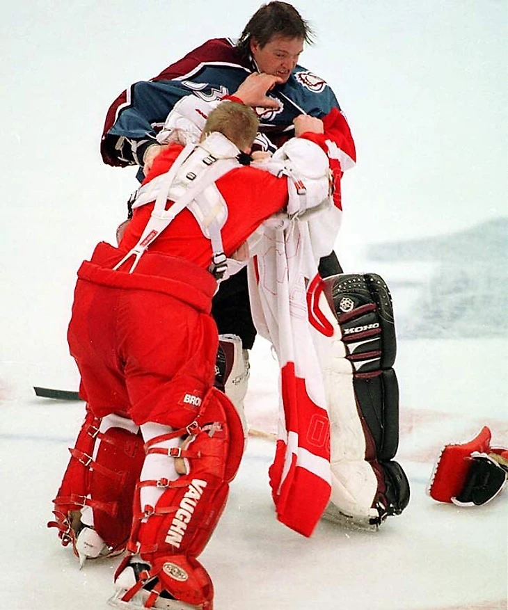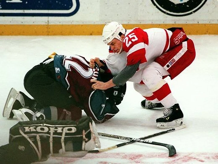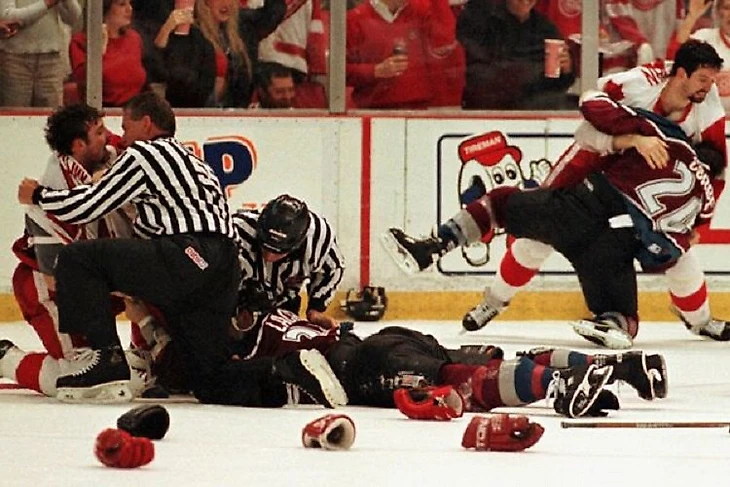 Всем привет! Сегодня, в «альбоме» будет третий и заключительный выпуск о Детройт Ред Уингз 90-х годов. (вот здесь первый, а тут второй) Мы вспомним об одном из самых легендарных противостояний тех лет: Детройт – Колорадо. В этом выпуске будет много фотографий драк, силовых приемов. Ну а что поделать, матчи между этими командами изобиловали силовым, грубым хоккеем. Сейчас, в современной НХЛ и не встретить такого зубодробительного противостояния. Ну, давайте вспомним о тех временах!
