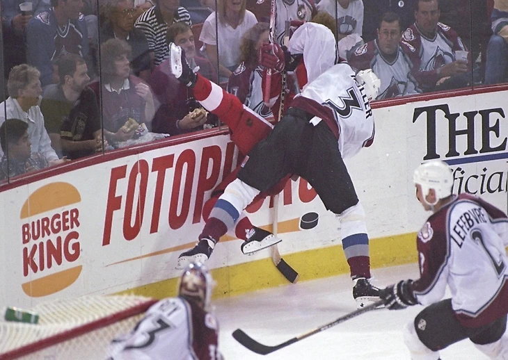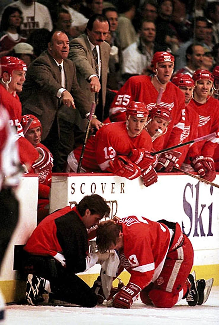 В матче финала Западной конференции 1996 года нападающий Эвеланш Клод Лемье атаковал в спину нападающего Ред Уингз Криса Дрэйпера…