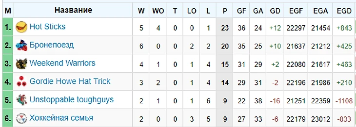 23 очка и лишь одно(!) поражение. Очень уверенная поступь новичков этого сезона. Отлично прошли второй круг и железнодорожники, одержав 4 победы и уверенно закрепившись на второй позиции. Браво! И уж как-то совсем непривычно видеть Хоккейную Семью на последнем месте. Что-то пошло у них не так, раз все 5 матчей второго круга были проиграны. Стоит Семье провести срочное собрание и разобраться как дальше то жить....