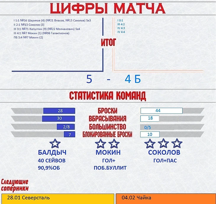 Помните, как ребята выбегали на вторую половину неделю назад? Ща порвём! За Даньку! За Сталина! Чем всё закончилось, все знают. В этот раз выходили на лёд спокойнее. И практически в первой же атаке счёт стал 3:1! Очередное удаление соперника, Молчанович проталкивает шайбу на свободного Капустина, Алексей делает пару шагов и прошивает кипера гостей! Через несколько минут Галактионов отправляется в слалом из своей зоны, привозит шайбу на чужой пятак, откуда свободный Мокин добивает её в пустые ворота, 4:1! Есть первый гол Алексея на турнире!