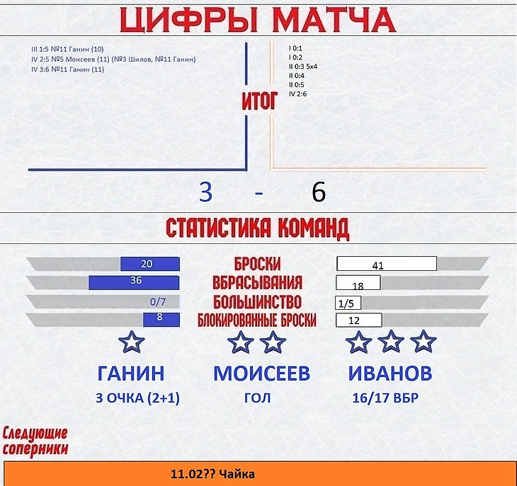 Мы стали ещё злее – в следующей же атаке оторвавшийся от соперников Ганин дальним броском делает счёт 3-6. А до конца ещё почти 6 минут! Можно говорить, что фантомчик на результат не повлиял, но при 3-5 дрожь в коленах «Северстали» была бы сильнее, да и манёвров у нашего тренерского штаба было бы больше. Но…. Мы ещё атаковали. Мы ещё бились и пытались, но на большее нас не хватило. 3-6, заслуженные аплодисменты и «молодцы» от болельщиков и тренера. Всё-таки вы, парни, можете!