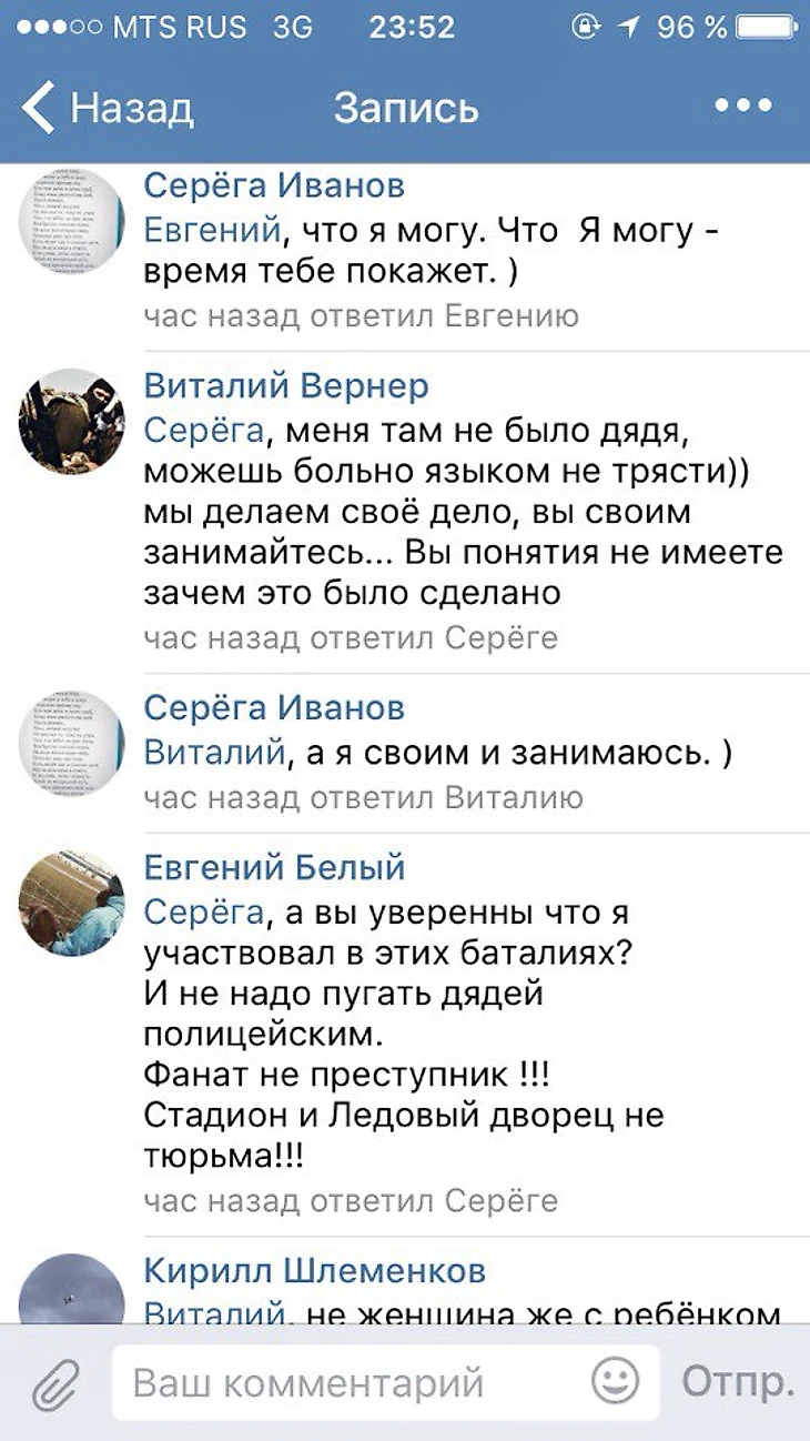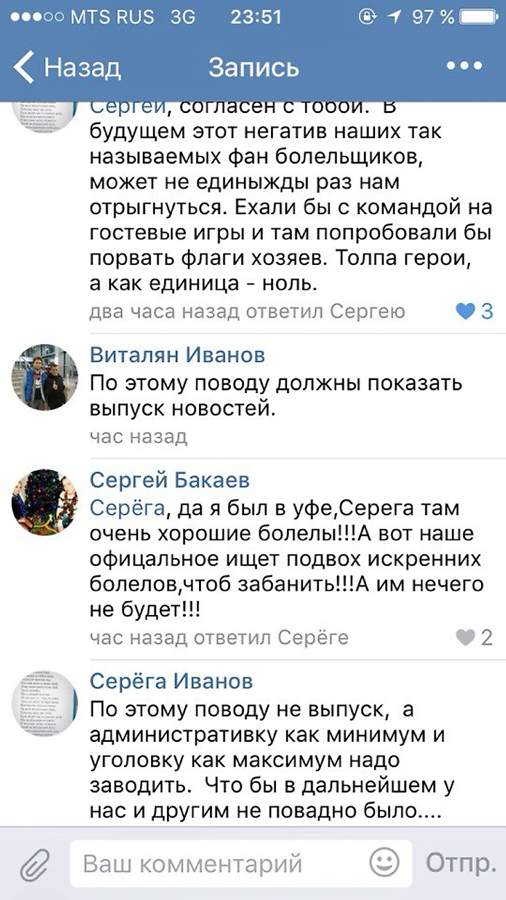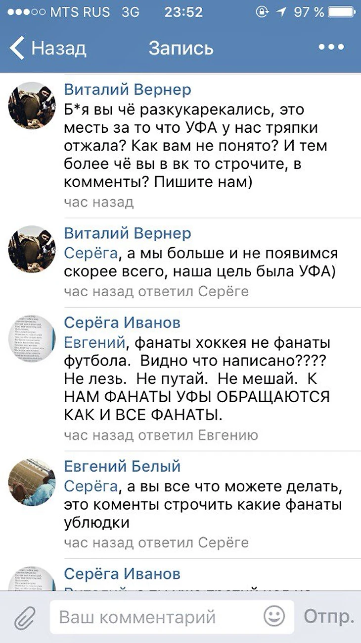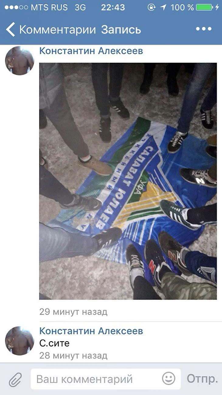 Хотя начать надо с предыдущего матча, когда представители местных "ультрас", как они себя сами называют, подходили к гостевому сектору, закрыв лицо, проводили разведку, спрашивали откуда прибыли болельщики, где автобус из Уфы, на что получили ответ, что все болельщики из Оренбурга, которые уже долгие годы, а кто-то и “с детства” болеет за юлаевцев, и "приезжих нет". Но убедившись, что гостей "слишком много" не решились что-либо совершить. К сожалению, на повторный матч у многих из фан-клуба не получилось прийти и хозяева осмелели. До 3 периода, оренбуржцы позволяли себе только оскорбительные кричалки в сторону гостей, даже перебрались на соседний сектор с противоположной стороны арены, чтобы болельщики уфимцев точно услышали и поняли насколько “рады” принимать команду в Оренбурге. И не только команду, самих болельщиков тоже. По словам, наших товарищей, "ультрас" о чём-то договаривались, но видя, что среди подростков есть взрослый никаких активных действий не предпринимали, но стоило нашему руководителю Венере Латыповой уйти после второго периода, как было совершено нападение на гостевой сектор. И напали на кого? На четверых подростков и девушку. Нападавших было около пятнадцати человек. В ультимативной форме требовали снять атрибутику, флаг и баннер. Когда гости не подчинились угрозам, "ультрасы" напали на ребят и сорвали баннер, который с нами с 2006 года, и в последствии порвали, а флаг, которому немногим меньше, чем баннеру, отобрали, вынесли на улицу и втоптали в грязь, тем самым демонстрируя сомнительное превосходство над болельщиками и командой из Уфы. Всё это действо происходило на глазах у охраны и представителей правопорядка, к которым подходила Венера и просила быть внимательней и указала, что болельщики "Сарматов" явно что-то замышляют и стоило бы предотвратить драку или что-то подобное. Но, видимо, не царское это дело исполнять свои служебные обязанности. Уже после потасовки нескольких из нападавших задержали охранники, но без выяснения обстоятельств задержанные были отпущены по домам. Впоследствии в группе "Толпара", в комментариях, появилась фотография растоптанного флага уфимцев. Но самые интересные подробности открылись в группе "Сарматов", где один из "ультрас" написал комментарий о "трофеях" и попытался обвинить болельщиков гостей в случившемся, аргументируя, что, якобы для болельщиков ФК "Уфа" это "норма" и они сами промышляют подобным образом; отобрать атрибутику гостей это величайшее достижение для настоящего болельщика своего клуба. Странная причинно-следственная связь, конечно. Отдельно стоит отметить, слова о том, что главной целью было именно отобрать атрибутику (и не важно, что “Толпар” - хоккейная команда, важнее, что это уфимская команда), показать гостям "их место" и прочий околофутбольный бред, которого среди болельщиков хоккея не наблюдалось долгие годы, а уж в молодёжном хоккее не было никогда. Администрация группы "Сарматов" вяло извинилась за произошедшее, но, как мы поняли, никаких действий предпринято не будет. Но разве так должно быть? Разве подобным образом должен хоккейный клуб реагировать на подобные происшествия? Именно с этим вопросом мы обращаемся ко всему хоккейному братству страны и просим поддержать нас в этой борьбе. Мы не просим крови, мы просим справедливости в борьбе с мракобесием и 