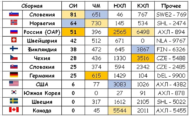 А вот по части опыта игры в КХЛ сборной России (ОАР), понятно, равных нет. В этом столбце выделяется гордый швейцарский ноль - "белые кресты" по традиции почти никак не представлены в других европейских лигах, и если куда из дома ездят, то в Америку. Ничего удивительного, в Швейцарии и жить комфортно, и платят хорошо. Кстати, у немцев была бы ровно та же картина, не включи они в заявку Феликса Шютца.