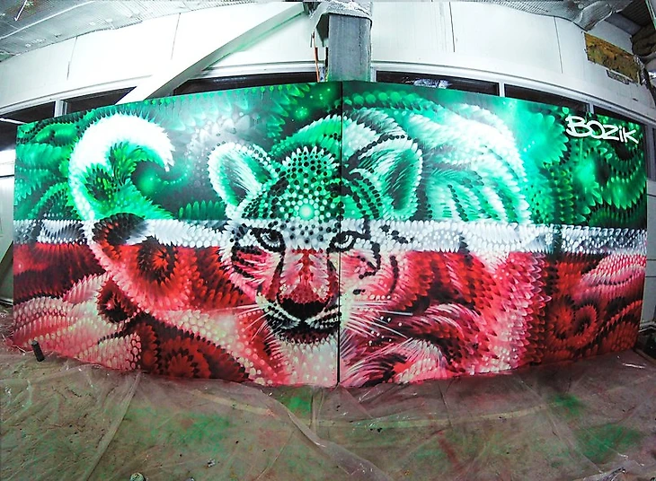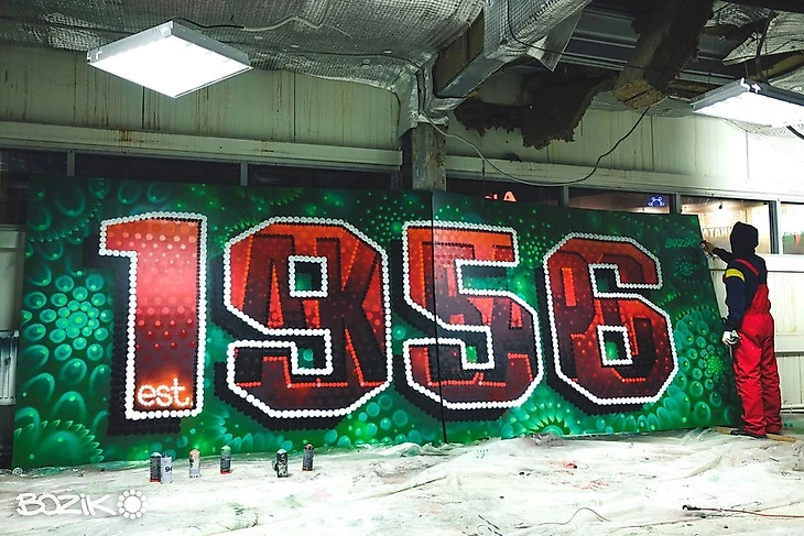 После обсуждения с граффитистом, известным в этой суб-культуре как Bozik, было принято решение немного доработать эскизы. Затем появились правки со стороны городской администрации, другие организационные моменты – в общем, конкурс затянулся и превысил заданные перед началом временные рамки. К этому надо еще прибавить корректировки рисунка после его нанесения, исправление дефектов, вызванных погодными условиями и т.д. – таким образом, в полном объеме проект был завершен лишь на днях.