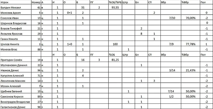 Но дальше не полетело всё подряд, парни не опустили рук. Очень много на себя принимали защитники, особенно усердствовал ужаленный перед матчем Яковлев. За 30 минут Ярик заблокировал 8 бросков! Вместе с Тимофеем они не пропускали за спину никого, здорово страховали друг друга, прекрасно вычищали пятак. За всю первую половину трио Балдыч-Яковлев-Власов всего один раз позволило сопернику организовать добивание. Да, до ворот в итоге долетело достаточно много, но либо Миша брал первые броски намертво, либо ребята контролировали отскоки. Молодцы! При этом в отличие от первой встречи с «Торпедо», мы не забывали созидать.