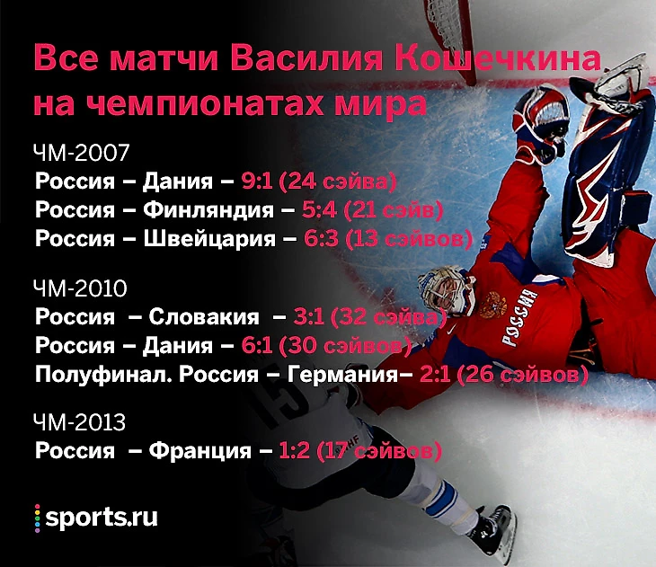 ЧМ-2013 в Швеции и Финляндии стал провалом сборной России. На последнем перед домашней Олимпиадой серьезном турнире наша команда вылетела еще в четвертьфинале – Билялетдинов ничего не придумал против сборной США (3:8). Но самым обсуждаемым стало поражение от французов на втором этапе. Как назло (для Кошечкина) – именно его поставили на ту игру, дав отдохнуть Варламову и Брызгалову.