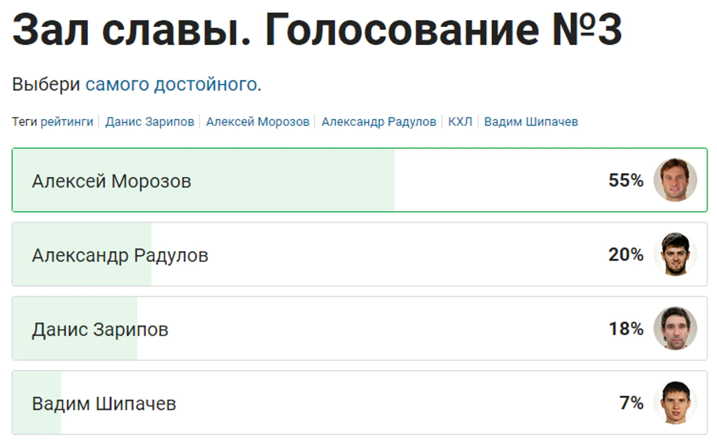 Всю прошлую неделю вы выбирали одного из четырех суперфорвардов лиги: Алексея Морозова, Александра Радулова, Даниса Зарипова и Вадим Шипачева. Легенда «Ак Барса» не оставил шансов своим оппонентам – за него проголосовали 55% пользователей.
