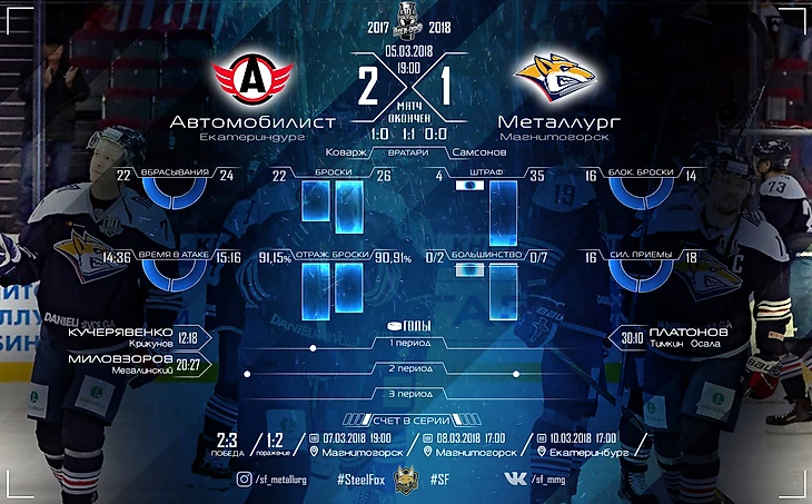 Сегодня "Автомобилист" не ставил перед "Магниткой" непреодолимых преград, сегодня сталевары проиграли сами себе. В третьем периоде не хватило тех самых сил и времени, что были затрачены при игре в меньшинстве. Все свои 4 гола за два матча автомобилисты забросили с контратак, с наскоков на ворота. Единственная более-менее добротная шайба - последняя на сей момент, заброшенная в начале второго периода второго матча Миловзоровым. Все остальное набросы с подставлением. Да, можно нахваливать скоростные качества нападающих соперника и ругать нашу оборону, растерявшую свой игроков, но факты есть факты. "Автомобилист" за 120 минут игры ни разу не запер "Магнитку" в зоне. Чтобы действительно серьезно так, с опасными моментами. Да и о чем говорить, если после этих же двух встреч, можно только с улыбкой вспоминать большинство нашего соперника, которое пока застыло на отметке "0" в графе "реализация". Полтора действительно опасных момента за 17 минут чистого большинства, из которых часть 5х3. И с другой стороны Якуб Коварж, в воротах Екатеренбурга, отбивавшийся, как белка в колесе от магнитогорских атак в меньшинстве. Только благодаря чеху счет на табло не перерос во что то большее. И это еще без удаленного Эллисона(надеюсь за его штрафом не последует дополнительных санкций).