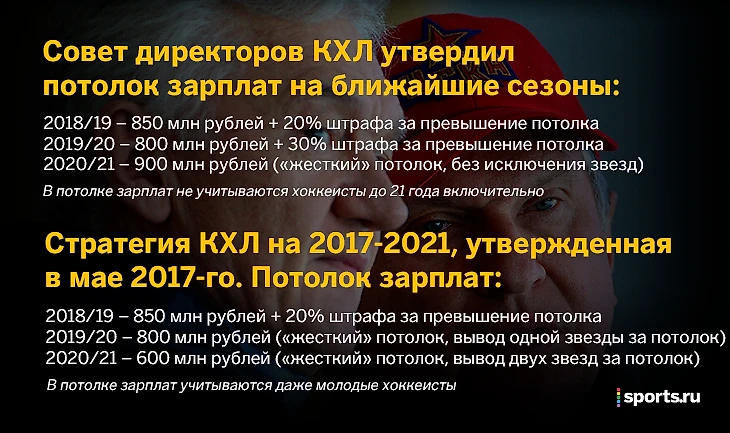 Но лига объяснила природу этих изменений: «Документ был доработан с учетом мнений клубов, ФХР и Минспорта РФ». Как видим, жесткий потолок отодвинули на год, и в этот лишний год будет увеличен штраф за превышение. На третий сезон жесткий потолок все-таки обещают ввести, но в нем не будут учитываться контракты игроков до 21 года. Это не самый принципиальный момент для большинства клубов – у молодых все равно контракты, в основном, очень небольшие. Но игроки вроде Кирилла Капризова или Ильи Сорокина двухлетней давности станут просто золотыми.