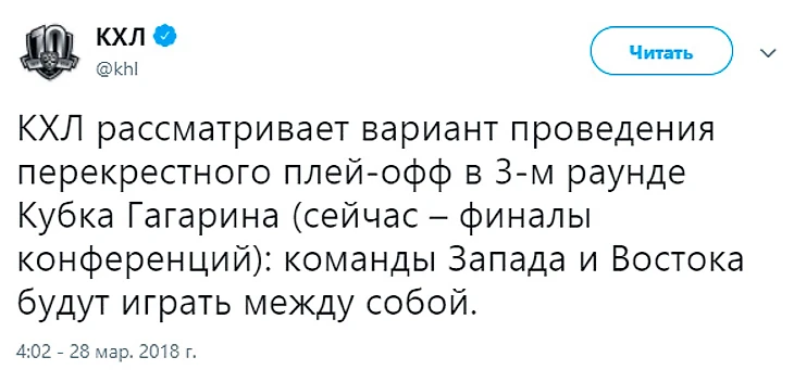 Действительно, когда два лучших клуба лиги физически не могут сыграть в финале, когда главная серия сезона происходит не в финале – это же плохо. Но перекрестный плей-офф рассматривается только с 3-го раунда. Чтобы ЦСКА и СКА не летали на Восток почем зря на ранних стадиях и не устали чрезмерно к серии, ради которой все это и затевается.