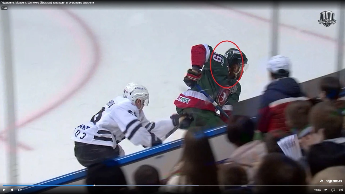 На видео хорошо видно что клюшка Марселя Шолохова попала в область уха, скользнув по визору. Крови не было, разбитых губ тоже.