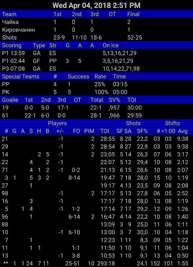 Если посмотреть на время, проведённое на льду, то стоит отметить больше 20 минут у Молчановича, и увеличение айс-тайма у Шилова. Ведь во всех предыдущих матчах Никита находился на площадке реже всех! При том, что он в итоге стал лучшим бомбардиром клуба второго этапа турнира. И за последний матч набросал больше, чем за предыдущие 5.