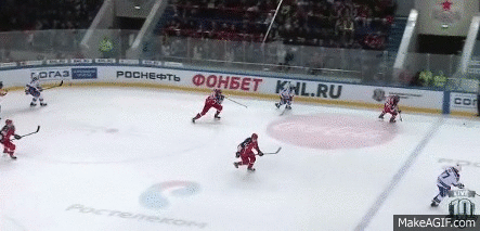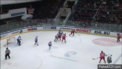 Здесь нападающие ЦСКА в "борцовском" режиме наседают на ворота, и доводят шайбу до пятачка, где им немного не хватает, чтобы замкнуть передачу.