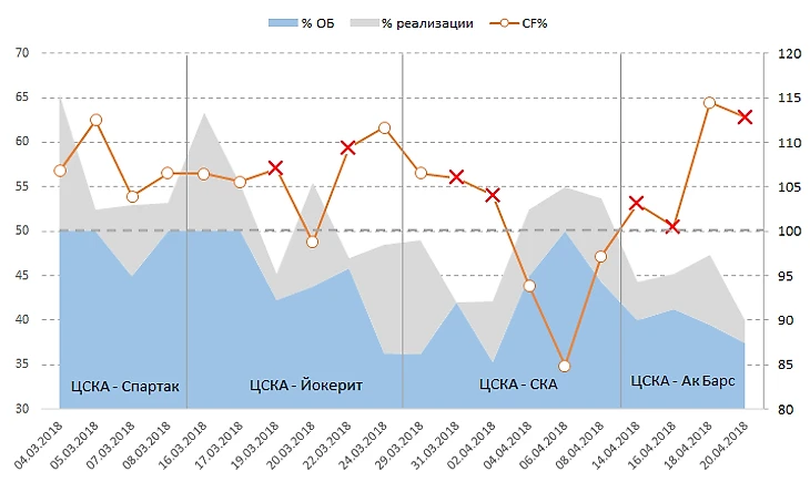 В этом материале обсуждается, как разница в счёте влияет на показатель Corsi. Мы это явно видим по ходу финальной серии, где Ак Барс большей частью ведёт в счете и отдаёт инициативу. Увидим ли мы какой-то другой сценарий, например, когда ЦСКА подолгу ведёт в счёте, или одна из команд выигрывает крупно? Жизнь покажет, но у Ак Барса есть козырь - более высокая эффективность атаки. Азеведо, Галиеву и компании требуется меньше моментов, чтобы забросить свои шайбы, и это очень серьезное преимущество в плей-офф.