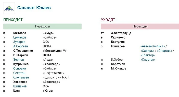 16.39 Пока открытие рынка в КХЛ получается откровенно скучным. Лучше всех поработали сегодня в «Салавате» и СКА. Но это далеко не все их потенциальные новички (жирным – подтвержденные трансферы, нежирным – слухи и переговоры)