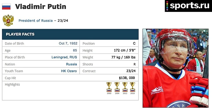 Впрочем, нельзя сказать, что Путину поддаются: в таких матчах игроки редко пластаются в обороне – хоть против Путина, хоть против дяди Васи, даже Фетисов довольно пассивно играл в своей зоне. Один из бросков президента в последнем матче был заблокирован прямо на линии ворот, куда встал защитник, а еще несколько раз голкиперы вытаскивали броски в упор – пусть партнеры Путина всячески подыгрывают ему, но соперники ради его голов с ворот не уходят.