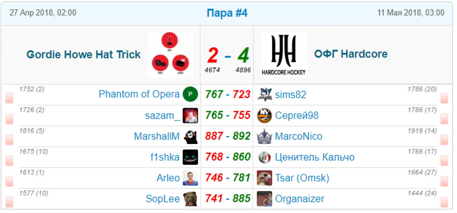 ОФГ Hardcore(14) заслуженно победили Gordie Howe Hat Trick(5), имея подавляющее преимущество в трех парах. И хотя MarcoNico (лучший в туре по ФО!) и победил MarshallM (4й в туре) с разницей лишь в 5 очков, по общему ФО у ОФГ преимущество более чем 200 очков (разгром тура!).