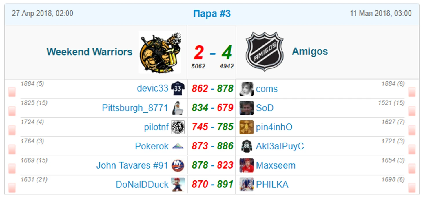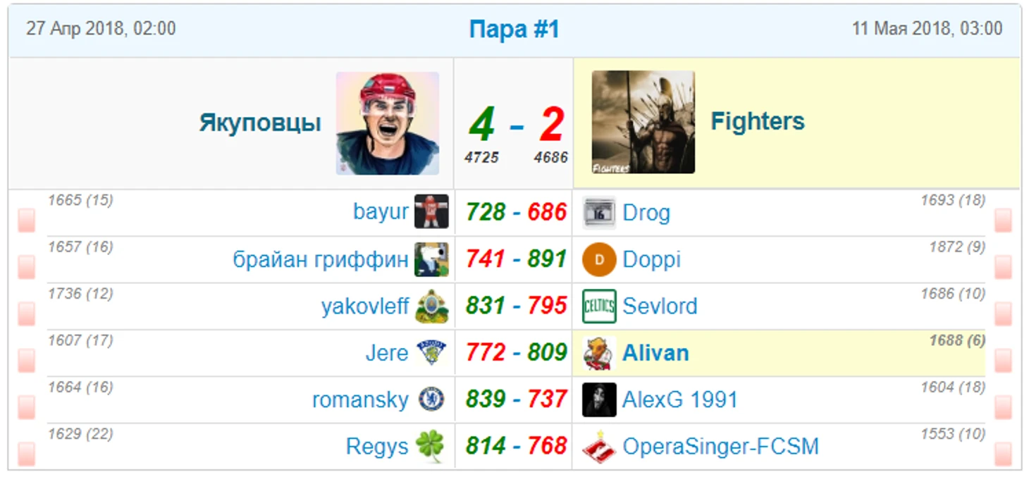 В этой паре сошлись Якуповцы(2) и Fighters(16). Победа над Бастердс дорого обошлась для Файтеров - у большинства игроков замен оставалось по минимуму, тогда как Якуповцы приберегли хороший запас замен. Ставка на пегов с его разгромными победами позволила Якуповцам получить комфортное преимущество в ключевых 4 парах, а запас замен помог контролировать ситуацию. Хорошо просчитав ситуацию перед последними матчами, Якуповцы малым числом замен смогли отстоять преимущество, несмотря на отчаянную попытку Файтеров перевести матч в овертайм. Заслуженная победа Якуповцев! Файтеры, я считаю, хорошо провели ПО и получили столь необходимый опыт игр на вылет.