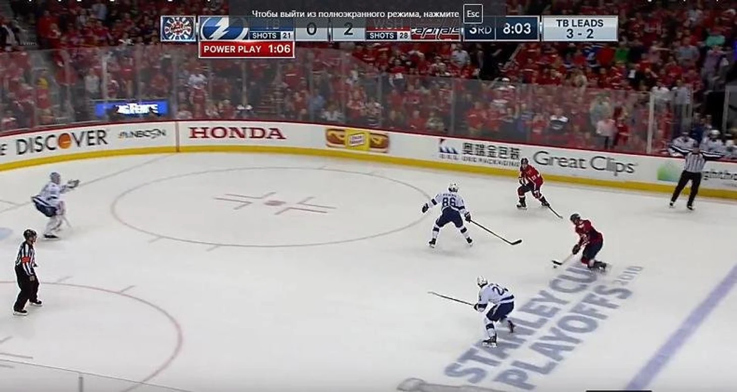 Еще пару скринов из концовки матча, когда «Тампа» играла в большинстве. Миллер неточным пасом обрезал трех человек, и...