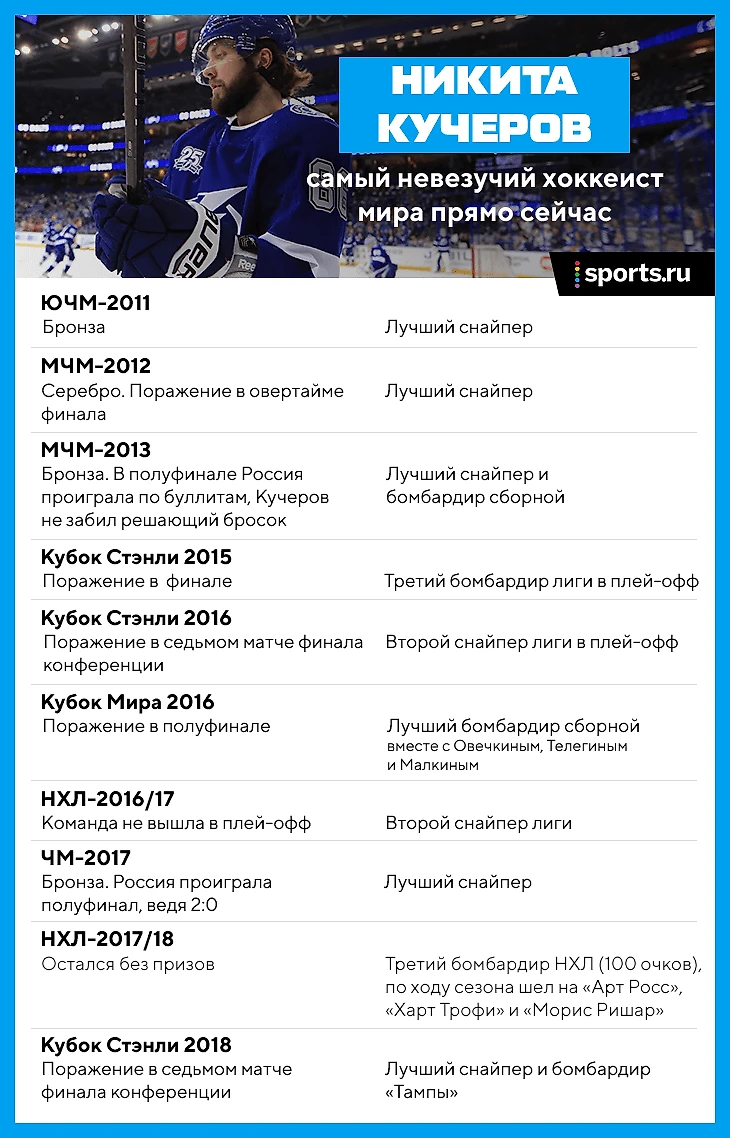По ходу нынешнего сезона его считали главным претендентом сразу на три личных приза – «Арт Росс Трофи» (лучшему бомбардиру регулярки), «Морис Ришар Трофи» (лучшему снайперу) и «Харт Трофи» (за наибольший вклад в успехи своей команды) – а «Тампу» видели одним из фаворитов Кубка Стэнли. Но Кучеров снова остался ни с чем.