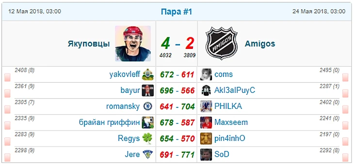 Якуповцы уверенно переиграли Амигос 4-2 с преимуществом в 200+ ФО. Не имея нужного запаса замен и сделав ставку на Тампу перед последними матчами, у Амигос не было шанса одержать еще две победы в парах. Якуповцы же контролировали ситуацию и обошлись минимум необходимых замен, оставив приличный запас на финал.