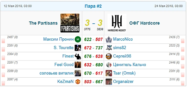 Во второй паре, где играли The Partisans с ОФГ Hardcore, все было намного интересней. Перед последним днем Партизаны уверенно выигрывали 5-1 с преимуществом в 250 ФО. Казалось бы, имея замены можно было бы довести матч до победы. Но, две сухие победы Вашингтона, переворачивают результат противостояния в этой паре. Героями (не принижая заслуг и других игроков команды) этих двух дней становятся sims82, вложившийся в Вашиков и набравший 268(!) очков и Organaizer, набравший 275(!) очков за два матча. Треть очков всего раунда этими ребятами были набраны за два матча!!! Невероятный камбэк и победа ОФГ Hardcore!
