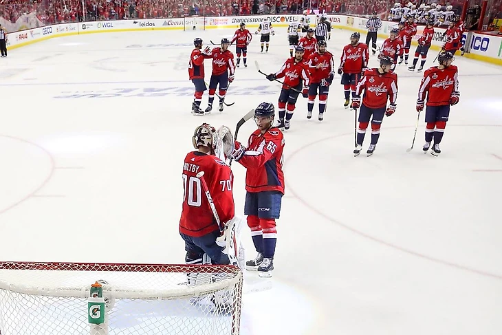 В начале третьего периода Вегас отыграл одну шайбу, это Нил отличился. 4-1. Через 7 минут игроки Вегаса снова огорчили Холтби и болельщиков Кэпиталс. Уже Смит записал на свой счет шайбу, ассистенты Сбиса и Маршессо. 4-2. Но буквально через минуту Вашингтон не заставил нервничать своих болельщиков. Ти Джей Оши в борьбе за шайбу, изящно оставил ее Бэксрему, попутно сломав нос сопернику. Бэки подхватил ее по флангу, отдал на дальнюю штангу, а там Кемпни 5-2. Ну а за 2 минуты до конца матча был забит шестой гол. Бэки отдает шайбу Кузе, Евгений делает пас вдоль ворот на штангу Коннолли, тот сделав небольшой круг, выезжает к центру ворот и прошивает Флери 6-2. Уверенная победа Кэпиталс, который приблизился к заветному Кубку Стэнли еще на один, победный шаг!