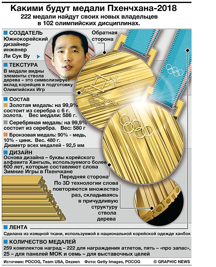 Медали зимней Олимпиады-2018 – самые тяжелые по весу за всю историю современных Олимпийских игр. И самые дорогие. Победителям и призерам придется носить на шее более полкило металла. Золотая медаль весит 586 граммов. При едином диаметре в 9,25 см толщина медалей в зависимости от их достоинства колеблется от 4,4 до 9,42 мм.