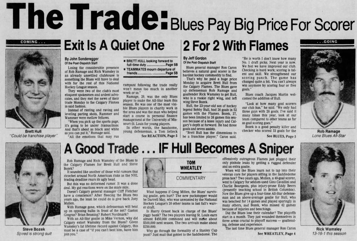 Ген.менеджер Калгари Клифф Флетчер допускал, что меняет игрока, который в будущем будет стабильно выбивать 50 шайб за сезон. И через несколько лет, каждый день покупая новую газету он будет читать, что Халл забил очередную шайбу.