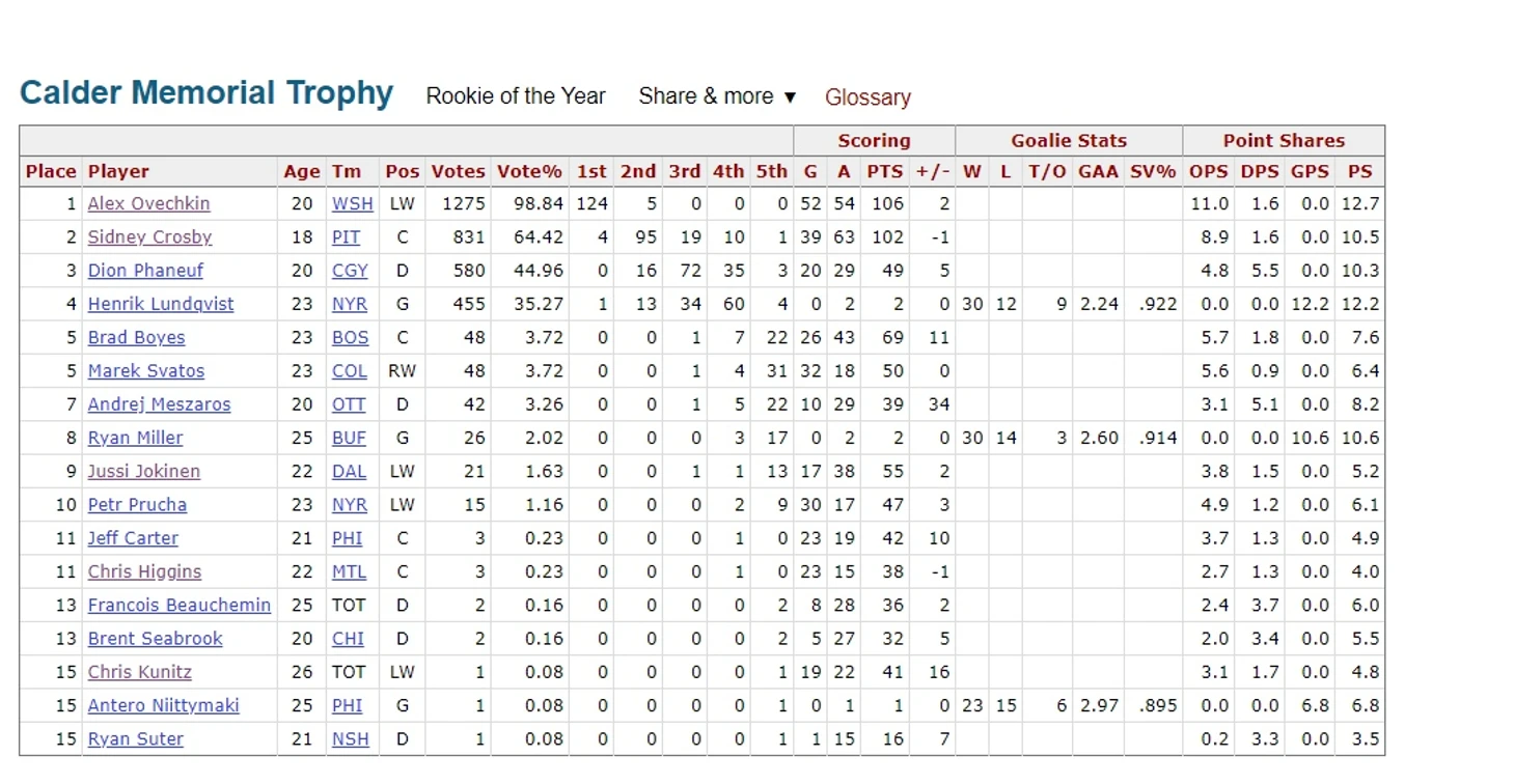 Достаточно сказать, что за последние четверть века (после сезона 1992-93, когда Селянне выбил 76 шайб) Кросби мог бы выиграть Колдер в любой год, причём едва ли не во всех случаях единогласно. За исключением сезона 2005/06.