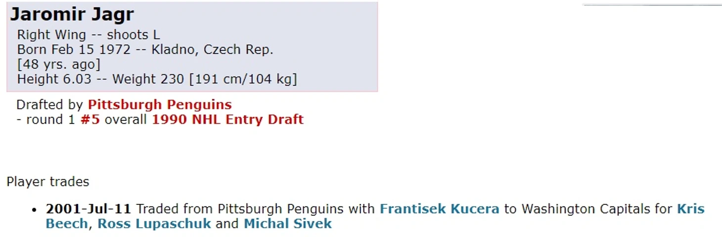 Так сразу и не вспомнить ещё один обмен, в котором обе участвующие стороны ухитрились столь феерически обосраться. Во многом в результате этого трейда Вашингтон и Питтсбург за 3 года скатились на самое днище и на драфте 2004 выбирали под 1 и 2 номерами (Овечкин и Малкин).