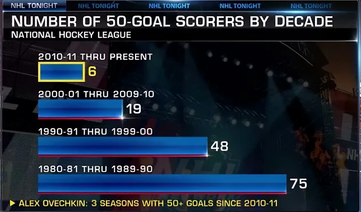 И, наконец, самое главное. Чтобы обосновать превосходство Овечкина-снайпера над Гретцки, приводят довольно сложные расчеты того, насколько сложнее сейчас забивать, нежели раньше. Например, вот такую картинку.