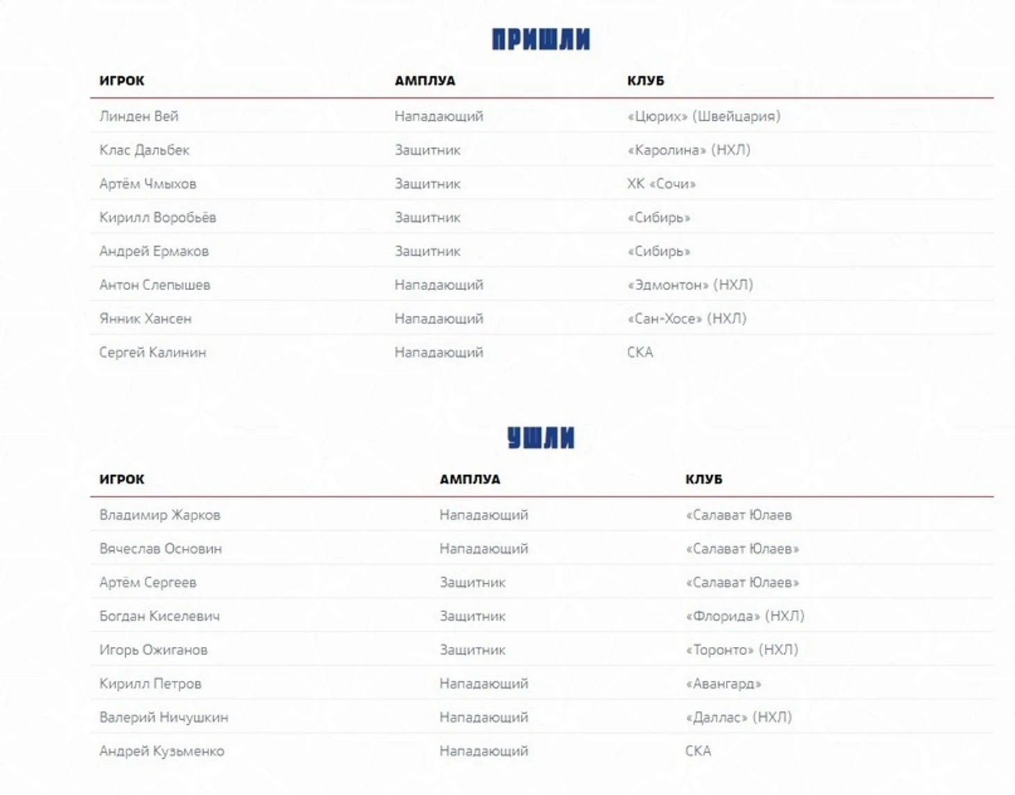 Киселевич, Ничушкин и Ожиганов отправились покорять НХЛ, пожелаем им удачи, ведь перспективы впринципе неплохие, Кузьменко, как уже было сказано был обменян в «СКА», Сергеев, Основин и Жарков были подобраны «Салаватом», который этим летом собирает все, что видит, Плэтт, давно выглядевший в клубе лишним отправился в «Йокерит», а Петрова сплавили в «Авангард» за якобы несоответствию соотношению цена/качество, хотя в плей-офф он был одним из немногих, кто тащил. Реальными потерями можно считать Ничушкина, Киселевича и Кузьменко, потери реальные, но не фатальные, так как никто из них не являлся Радуловым или Зайцевым, то есть системообразующим игроком, а ростер «армейцев» как известно переполнен, поэтому брешь в нем не образовалась. Шумаков и Любимов на данный момент по-прежнему числятся в «ЦСКА», но на площадке в их форме мы уже вряд ли увидим.