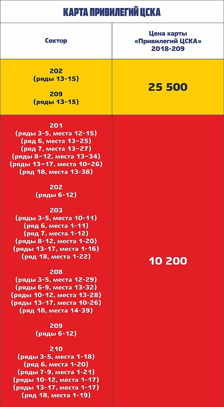 Карта привилегий ЦСКА позволяет держателю на протяжении всего сезона приобретать билет на определенное выбранное место по номинальной стоимости, включая билеты на матчи Плей-офф Кубка Гагарина. Данная карта позволяет держателю иметь закрепленное за ним место на протяжении всего сезона без обязательства его выкупа.