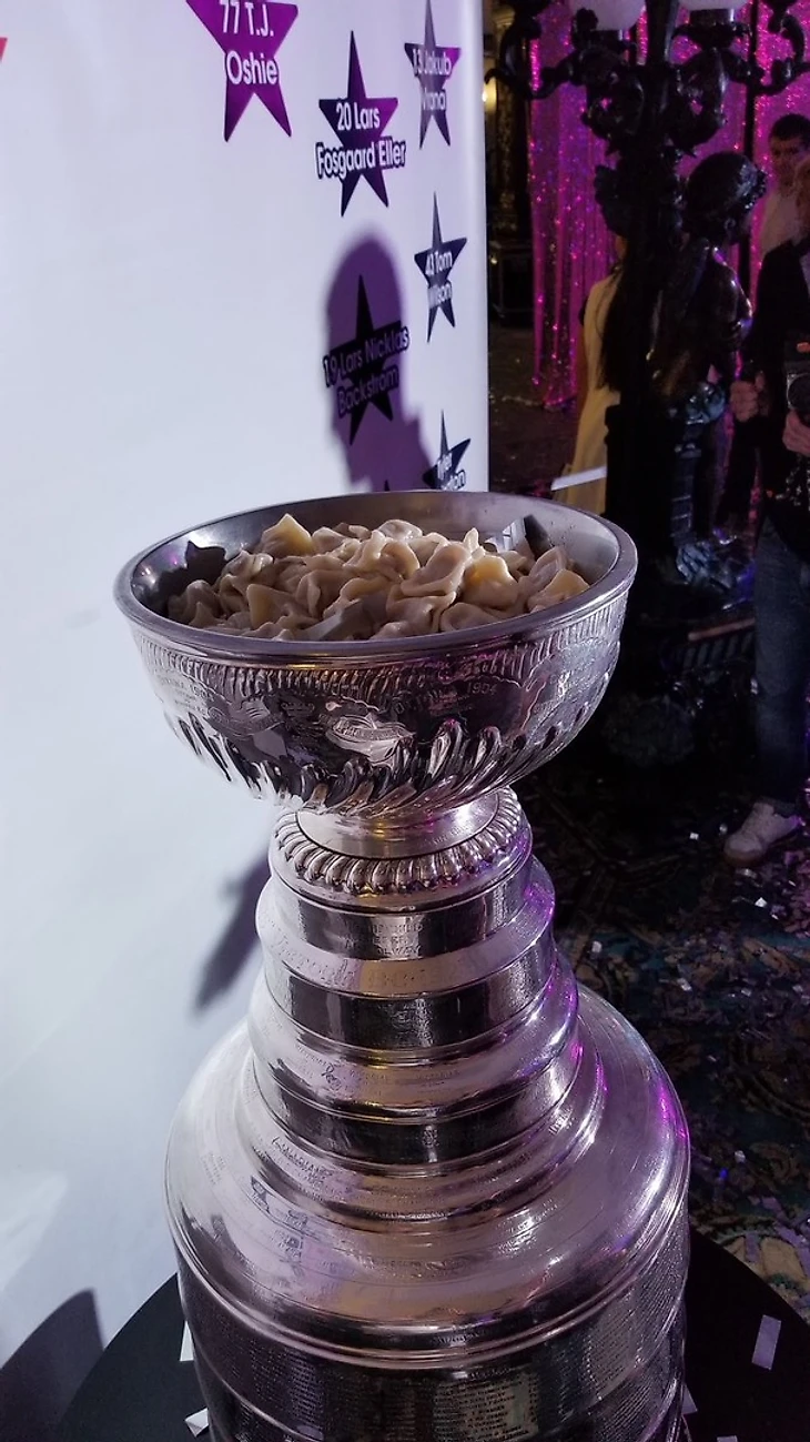Об этом твитнул хранитель Кубка Стэнли Филип Притчард: «Нет ничего лучше для завершения дня... Русский стиль. Традиционные пельмени из Кубка Стэнли».