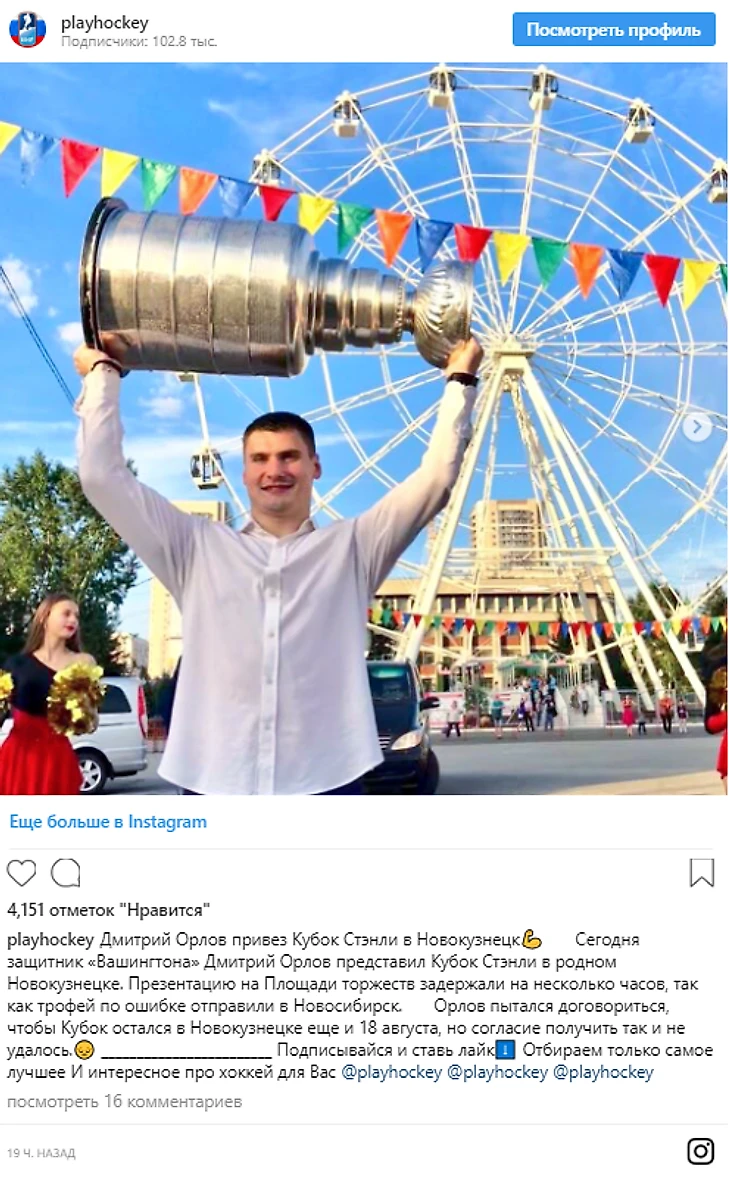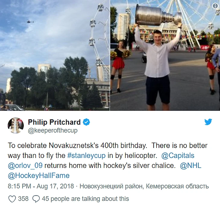 Для празднования 400 дня рождения Новокузнецка ничего не может быть лучше, как доставить сюда Кубок Стэнли на вертолете. Игрок «Кэпиталз» Орлов возвращается домой с серебряной хоккейной чашей