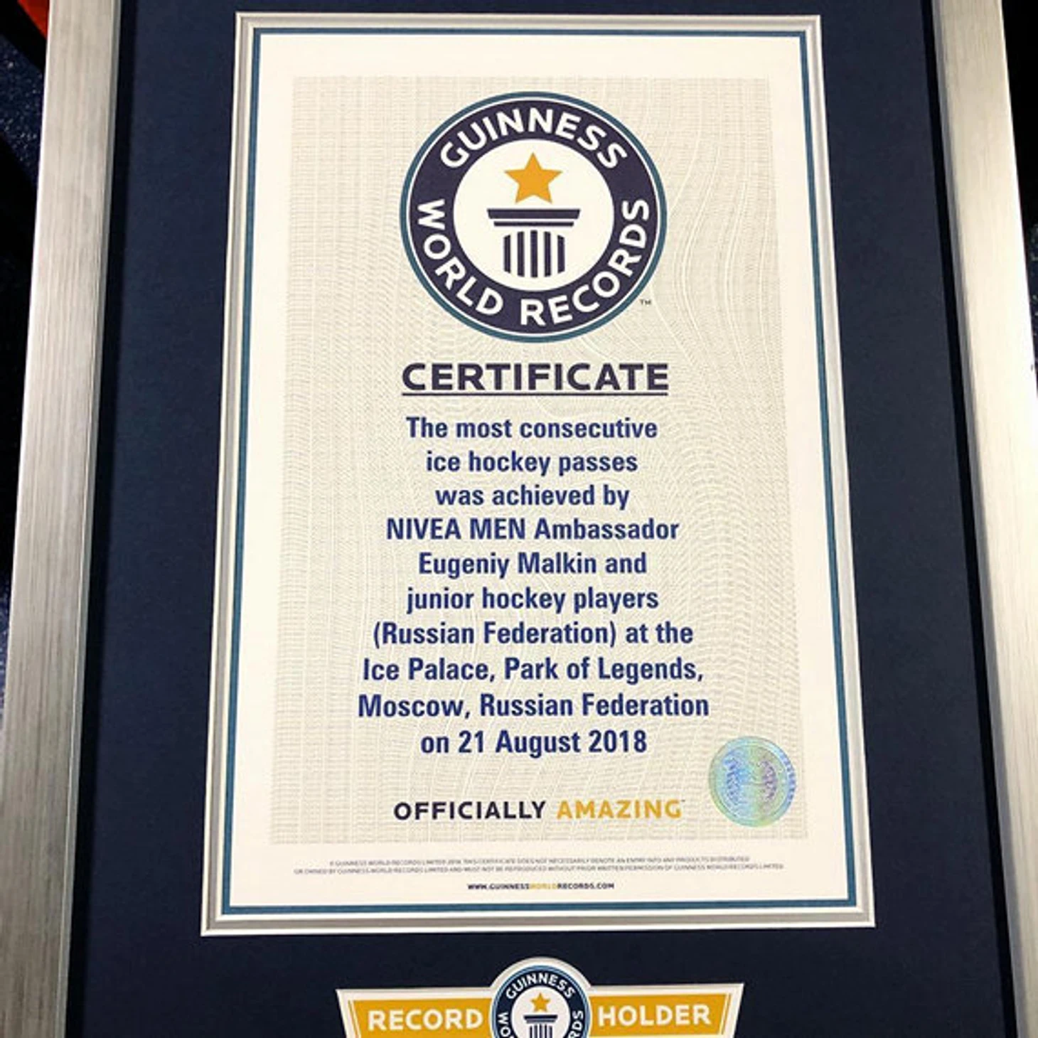 Вместе с юными ребятами из московских хоккейных спортшкол Малкин вписал себя в Книгу Гиннесса в номинации «Самая длинная хоккейная комбинация». Игроки должны были сделать не меньше сотни передач, каждая из которых не меньше 9,1 метра. На обработку и следующий пас давалось не больше пяти секунд. С этим успешно справились все.